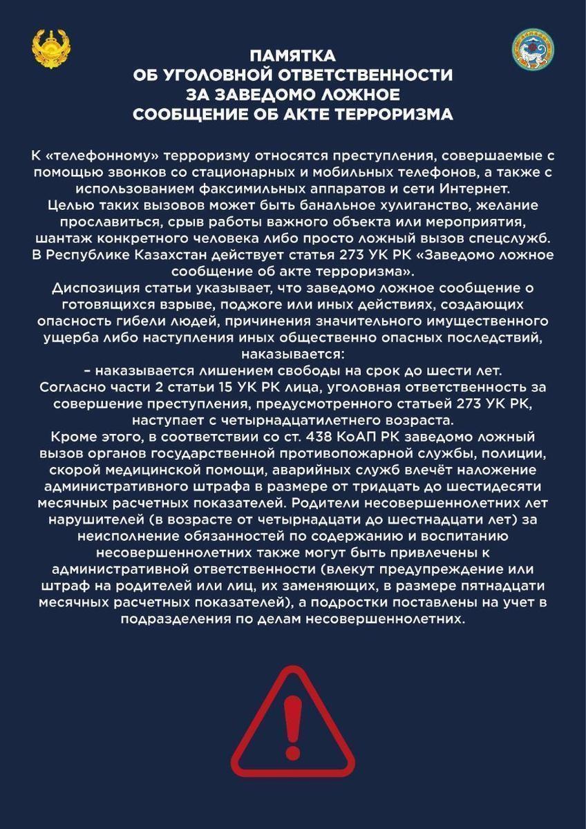 12 сәуір 2021 0 1 2 3 4 5 Памятка об уголовной ответственности Памятка об уголовной ответственности за заведомо ложное сообщение об акте терроризма