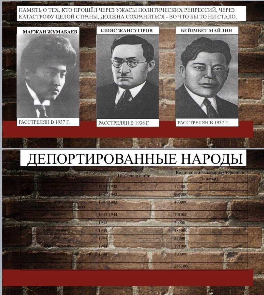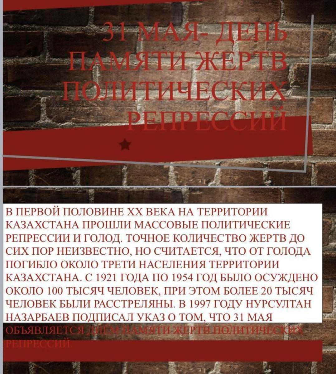 31 мая - день памяти одной из самых трагических страниц истории Казахстана - массовых политических репрессий и ужасающего голода, повлекшего гибель миллионов человек. с 1997 года, в Казахстане отмечается День памяти жертв политических репрессий. в числе невинно осужденных были такие видные государственные и политические деятели как Әлихан Бөкейхан, Ахмет Байтұрсынұлы, Міржақып Дулатұлы, Тұрар Рысқұлов, Сәкен Сейфуллин и Мұхамеджан Тынышбаев.