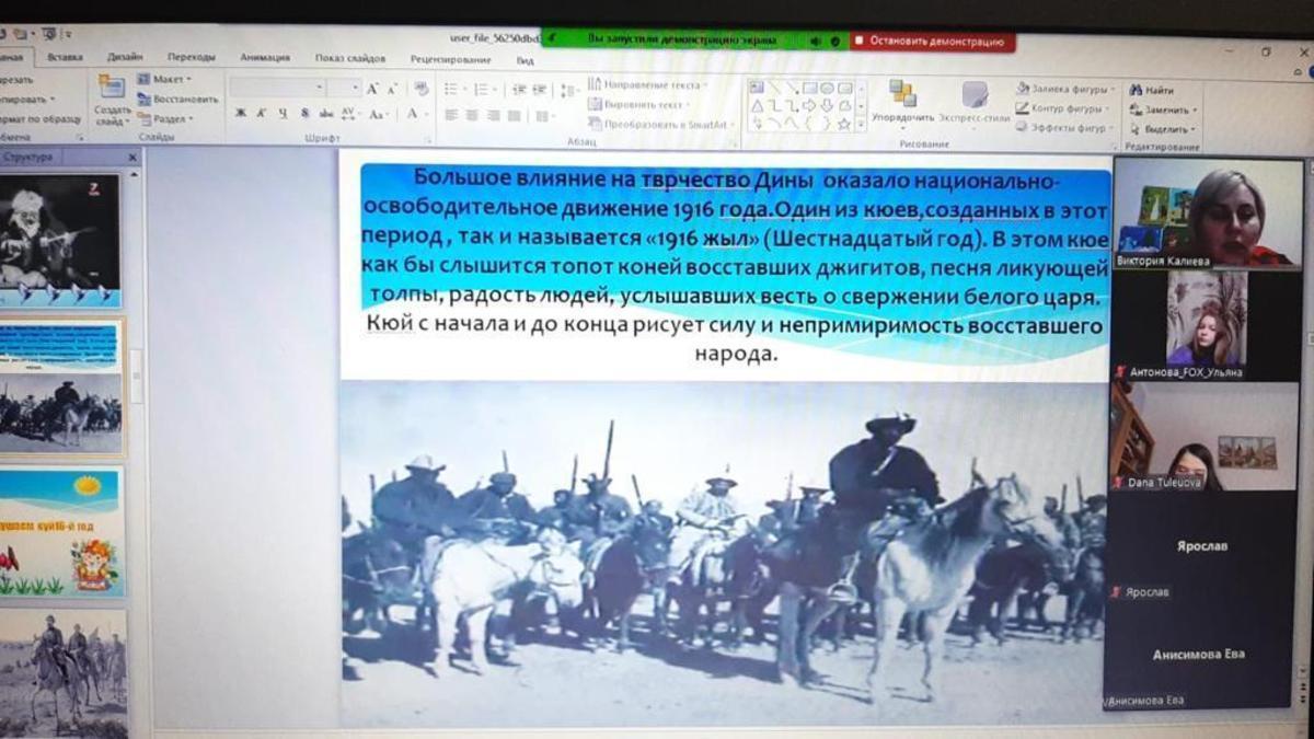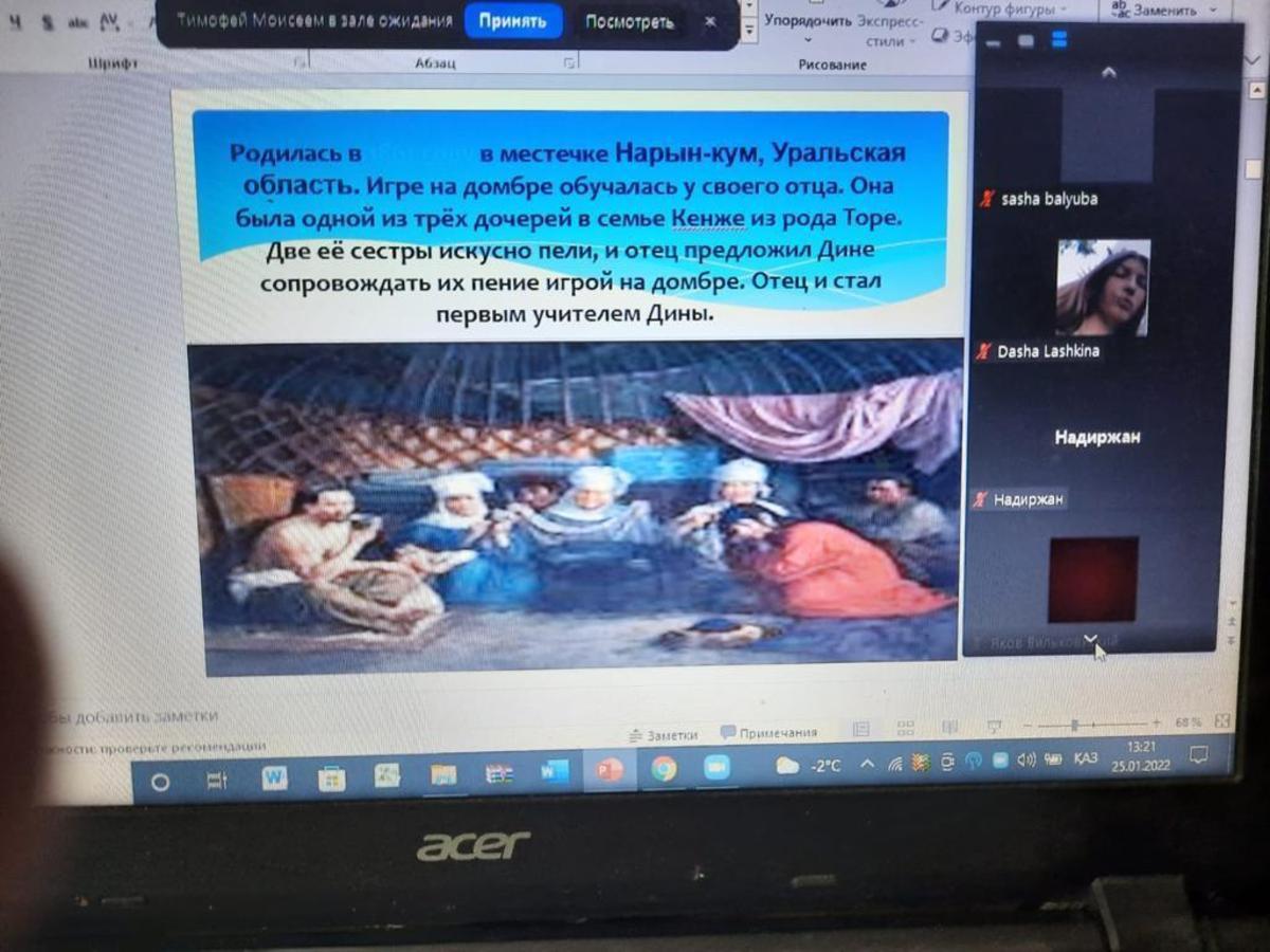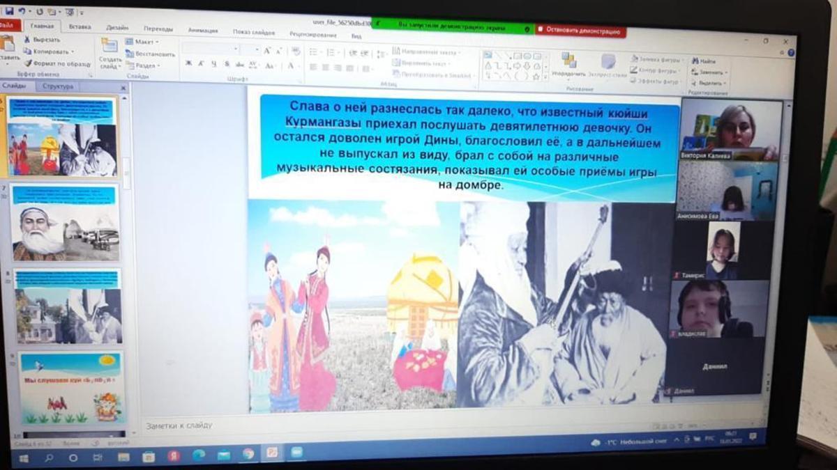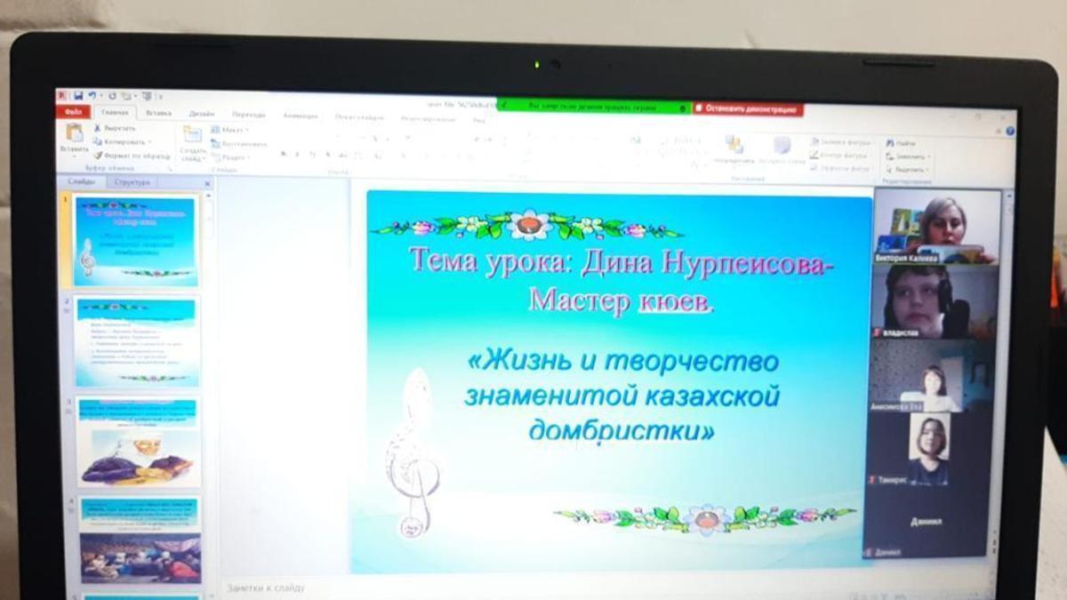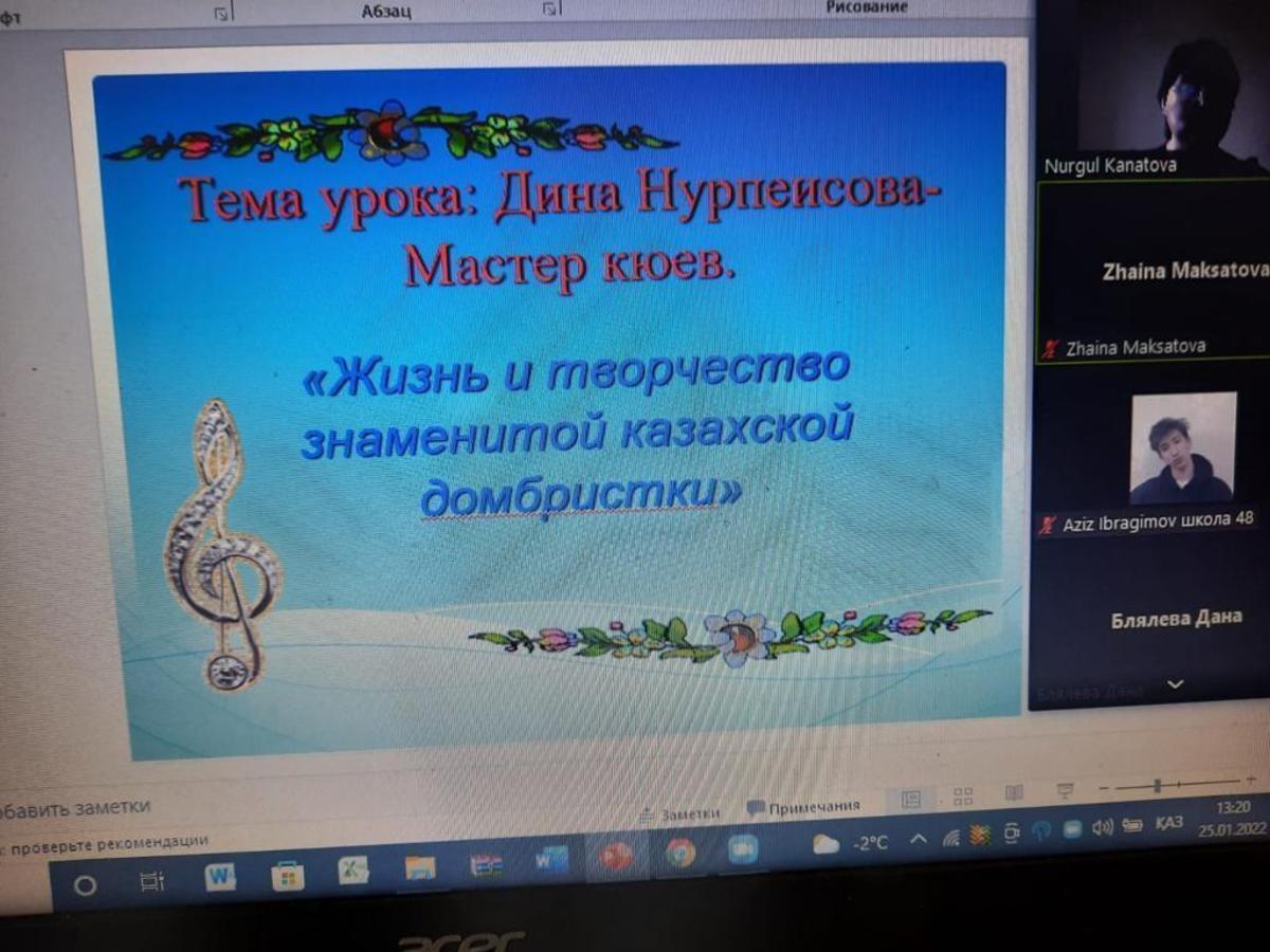 В школе были классные часы посвященной Дине Нурпеисовой. Ди́на Нурпеи́сова — казахский композитор и исполнитель на домбре, ученица Курмангазы Сагырбаева, автор сочинений для домбры в традиционном жанре кюя. Народная артистка Казахской ССР.