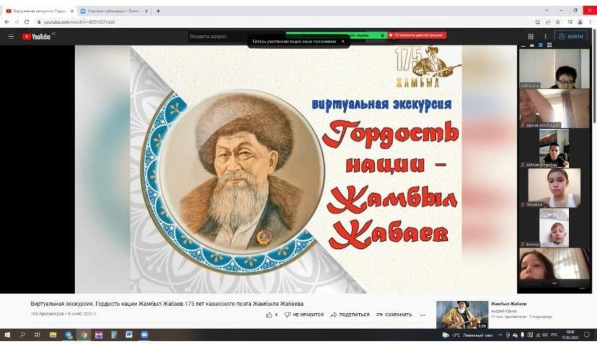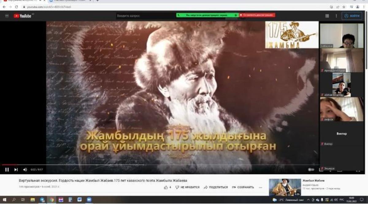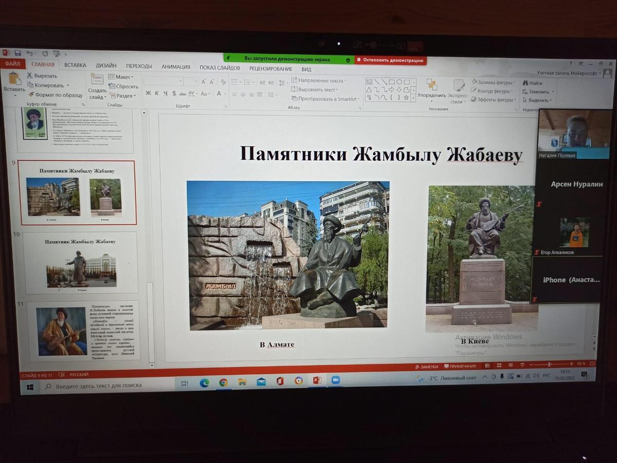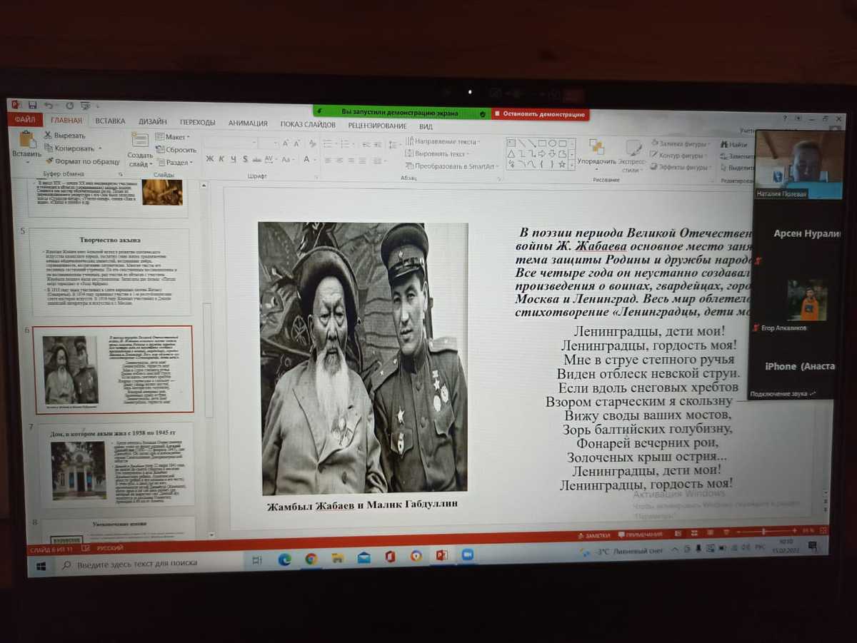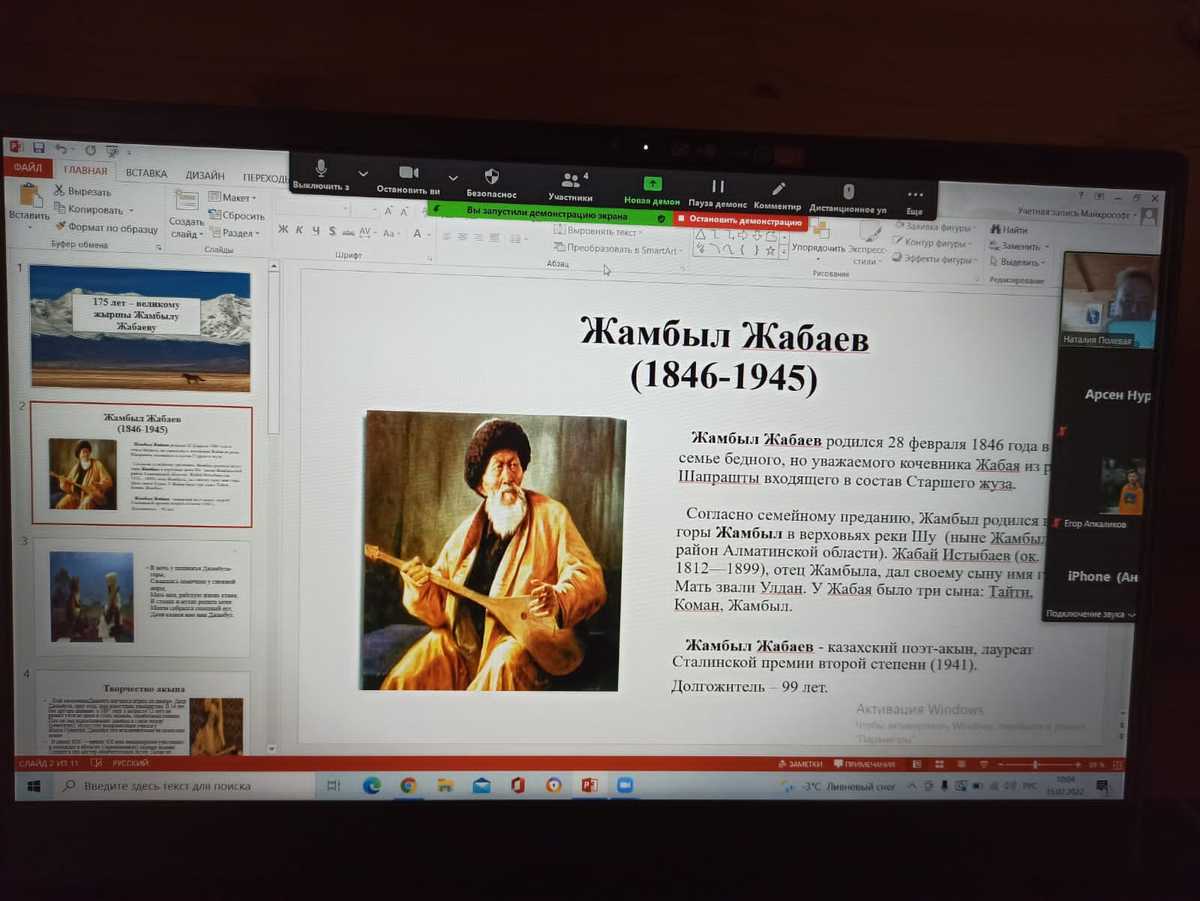 Жамбыл Жабаев (16 (28) февраля 1846 — 22 июня 1945) — великий казахский советский поэт-акын, лауреат Сталинской премии второй степени (1941). Выдающийся представитель казахской народной поэзии, мастер стихотворного слова, сказитель, жырау. Родился у подножия гор Жамбыл в Жамбылской области, умер в селе Узынагаш Алматинской области; происходит из рода екей, племени шапырашты, старшего жуза. Окружение Жамбыла высоко ценило песни, кюи, искусство импровизации и сказительства. Жамбыл - и эпический акын, и акын-импровизатор, мудрый жырши и сказитель. Как мастер искусства он способствовал формированию гражданственно-политической поэзии. Величие Жамбыла не только в его поэтическом мастерстве, но вместе с тем и в том, что он создатель нового направления в народной поэзии, мудрый вдохновитель творческого духа народных акынов. Его слова обратились в лозунги, его назвали отцом народной поэзии. Жамбыл, повернув в новое русло глубокие эпические традиции певцов-сказителей, открыв новые грани древнего казахского искусства импровизации, придал им новое содержание. Жамбыл - поэт-интернационалист, не деливший людей на расы и нации. Стихи Жамбыла - как жемчуг, раскиданный на морском дне.