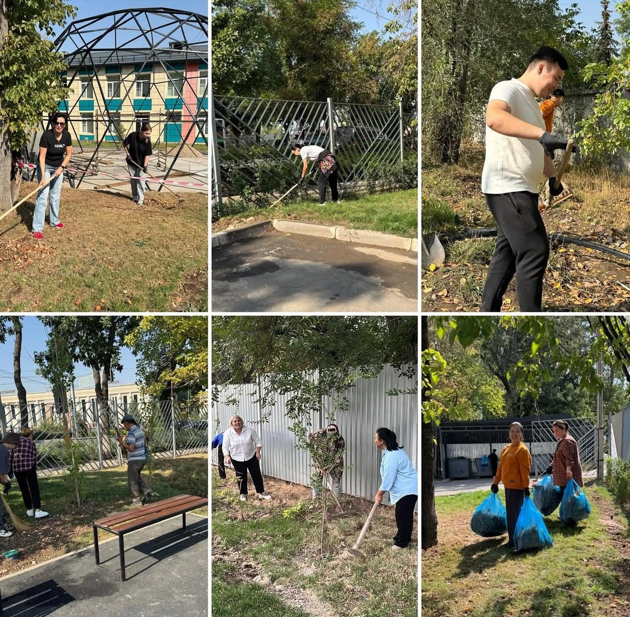 Оқушылар мен педагогтардың мектеп ауласын тазалау бойынша бірлескен жұмысы: сырлау, абаттандыру, өсімдік отырғызу. Іс-шара еңбекқорлықты, жауапкершілікті және командалық рухты дамытуға ықпал етті.