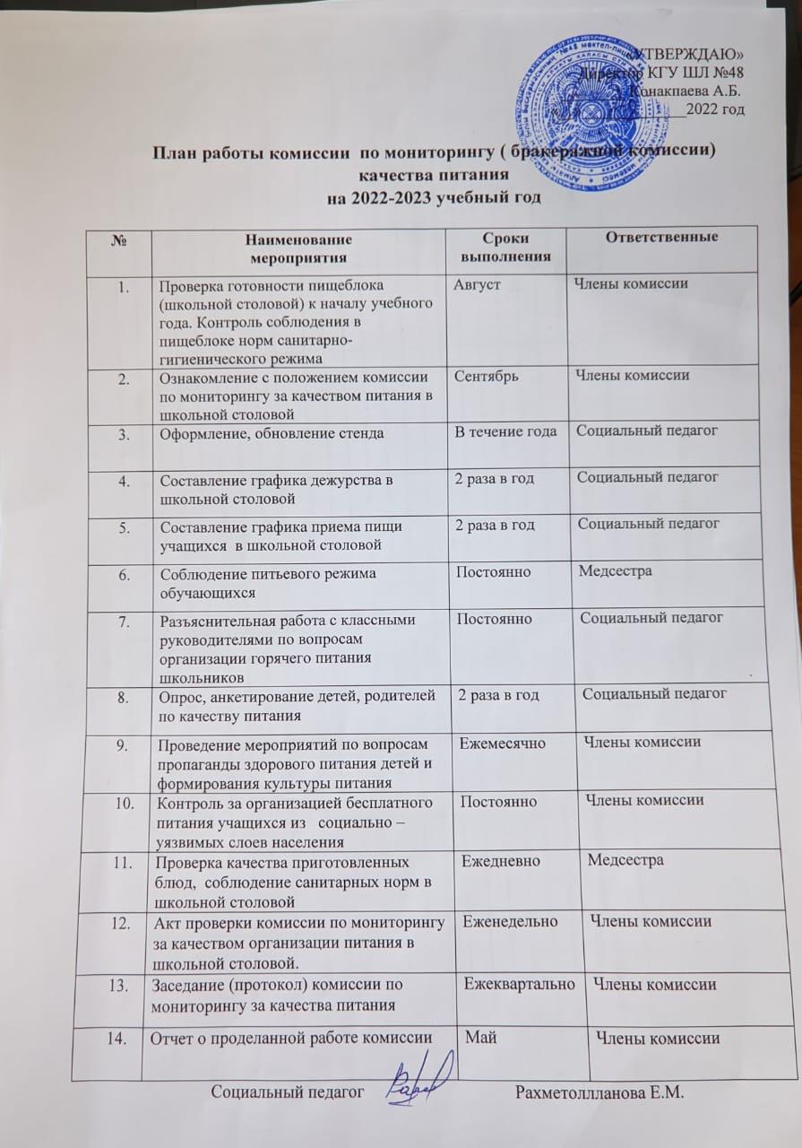 31 тамыз 2022 0 1 2 3 4 5 План работы комиссии по мониторингу (бракеражной комиссии) качества питания на 2022-2023 учебный год План работы комиссии по мониторингу (бракеражной комиссии) качества питания на 2022-2023 учебный год