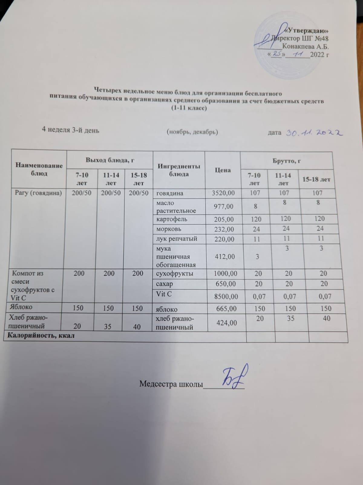 30 қараша 2022 0 1 2 3 4 5 Меню на среду (4 неделя 2022-2023 уч.года) Осень Четырехнедельное меню блюд для организации бесплатного питания обучающихся в организациях среднего образования за счет бюджетных средств