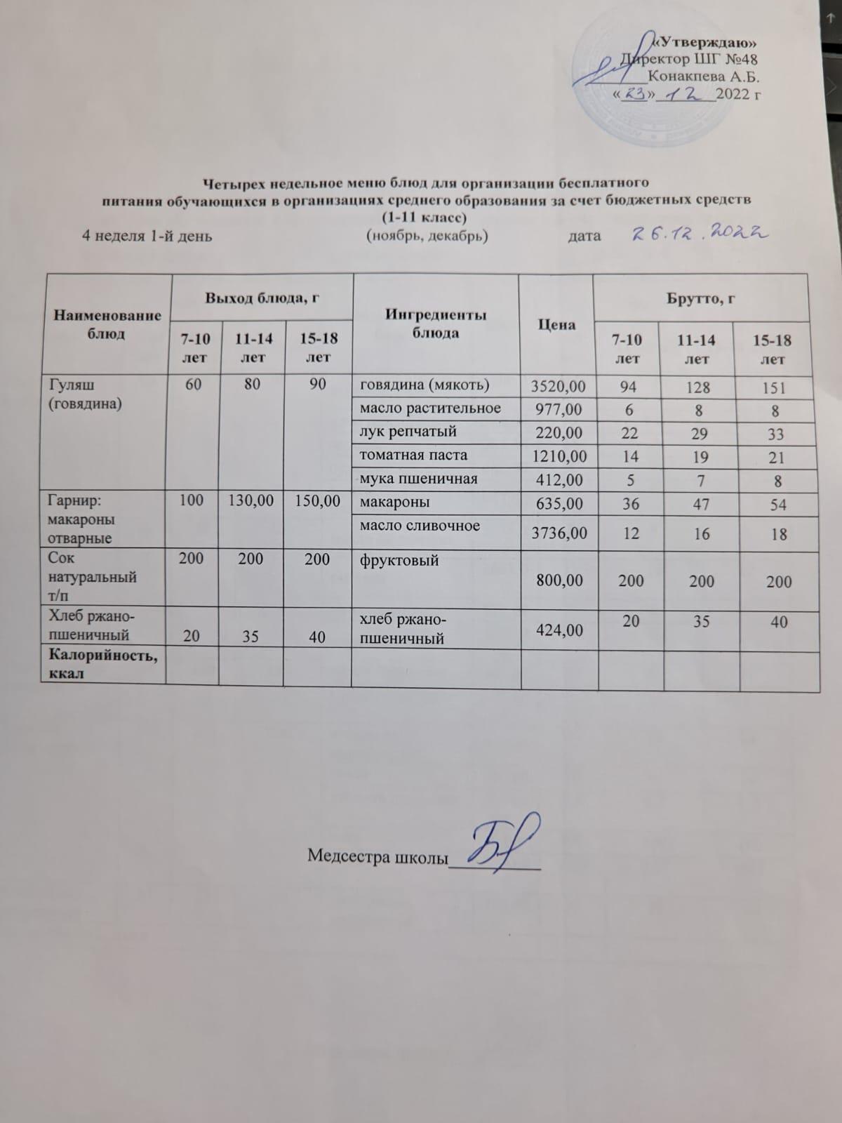 26 желтоқсан 2022 0 1 2 3 4 5 Меню на понедельник (4 неделя 2022-2023 уч.года) Четырехнедельное меню блюд для организации бесплатного питания обучающихся в организациях среднего образования за счет бюджетных средств