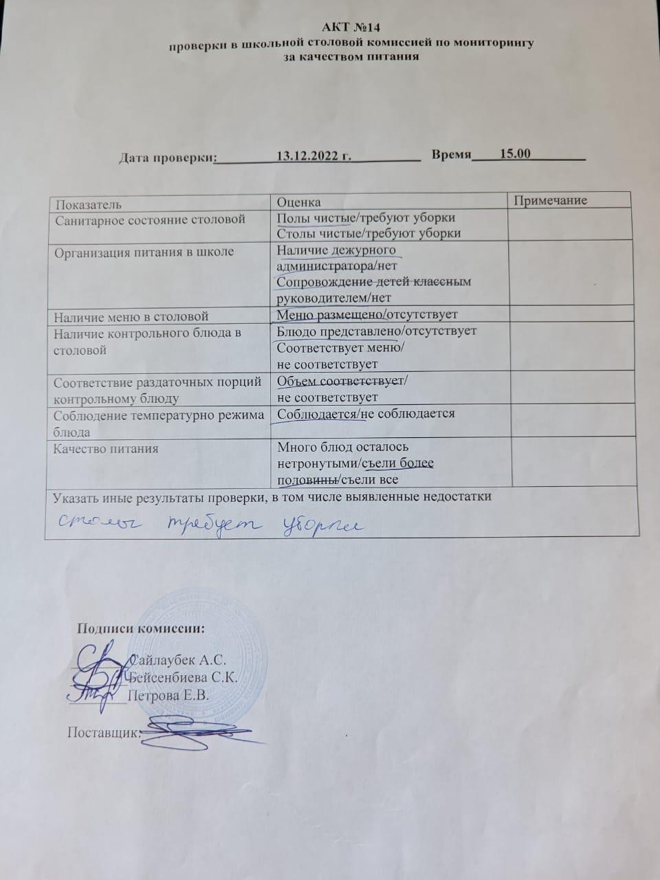 АКТ проверки организации питания в школьной столовой