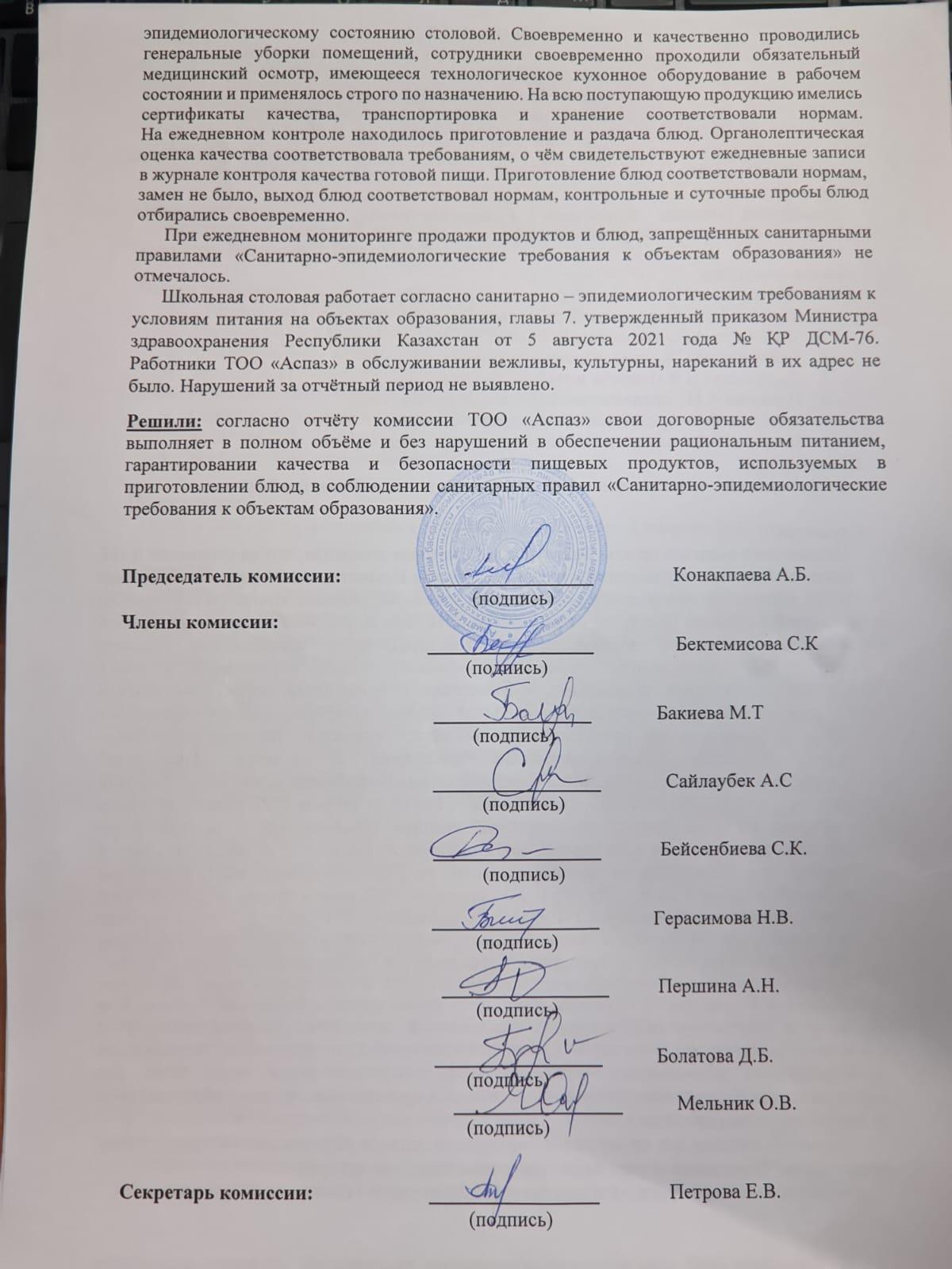 "№48 мектеп-лицей"КММ асханасында тамақтану сапасына мониторинг жүргізу жөніндегі комиссия отырысының хаттамасы