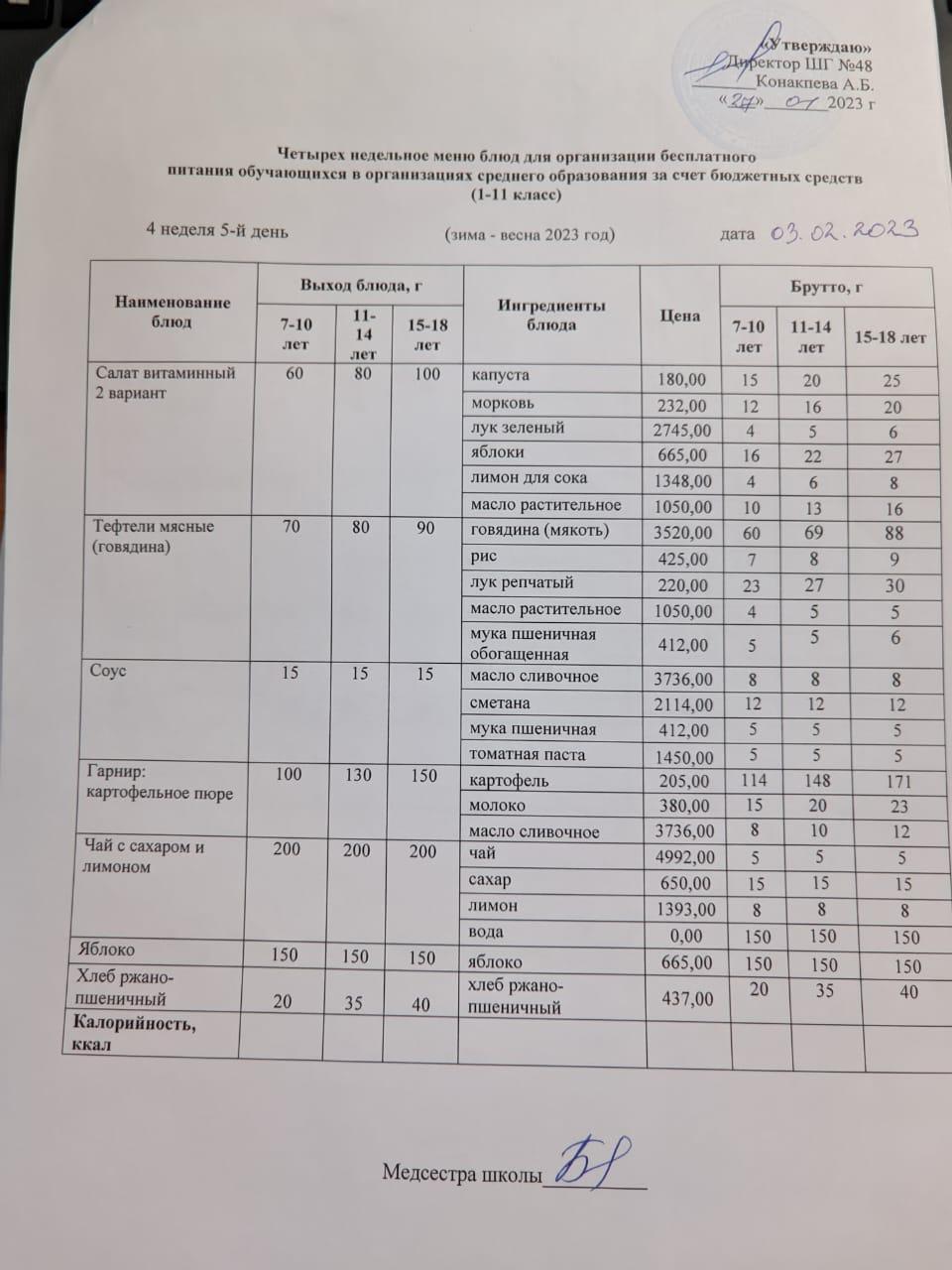 Бюджет қаражаты есебінен орта білім беру ұйымдарында білім алушыларды тегін тамақтандыруды ұйымдастыру үшін төрт апталық ас мәзірі/ Четырехнедельное меню блюд для организации бесплатного питания обучающихся в организациях среднего образования за счет бюджетных средств