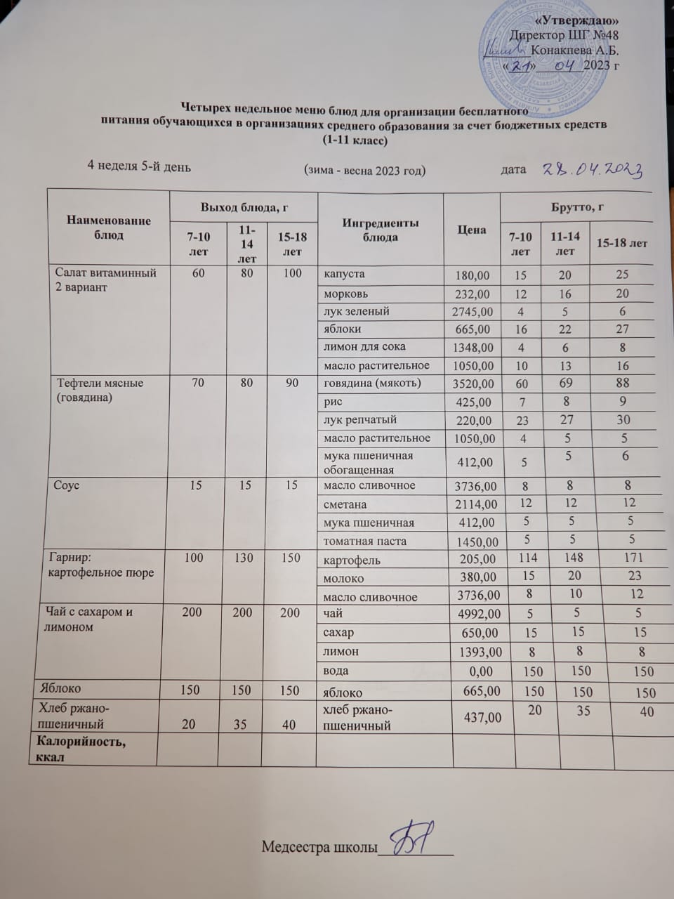 Бюджет қаражаты есебінен орта білім беру ұйымдарында білім алушыларды тегін тамақтандыруды ұйымдастыру үшін төрт апталық ас мәзірі/ Четырехнедельное меню блюд для организации бесплатного питания обучающихся в организациях среднего образования за счет бюджетных средств