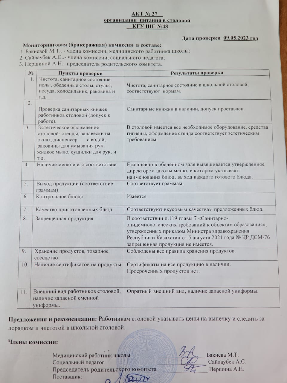 09 мамыр 2023 0 1 2 3 4 5 Мектеп асханасын мониторингтік комиссияның тексеру нәтижелері туралы білім алушылардың тамақтануын ұйымдастыру мен сапасын бақылау бойынша АКТ № 27 АКТ №27 проверки комиссии по мониторингу по проверке качества питания в школьной столовой ШГ №48