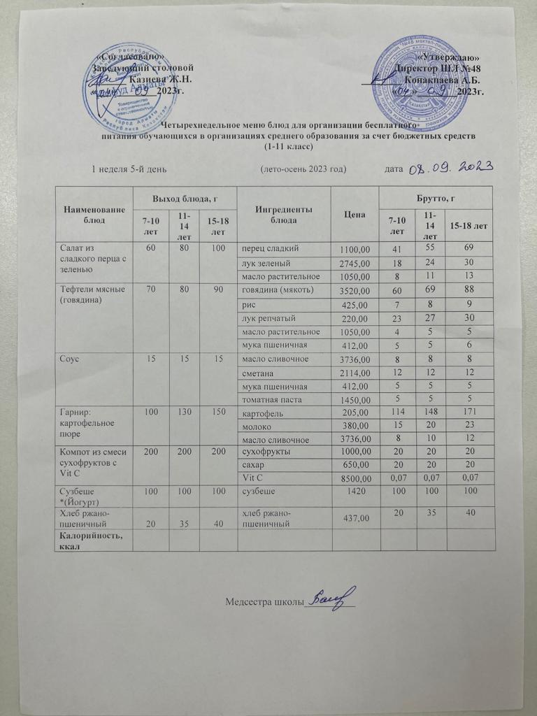 Бюджет қаражаты есебінен орта білім беру ұйымдарында білім алушыларды тегін тамақтандыруды ұйымдастыру үшін төрт апталық ас мәзірі/ Четырехнедельное меню блюд для организации бесплатного питания обучающихся в организациях среднего образования за счет бюджетных средств