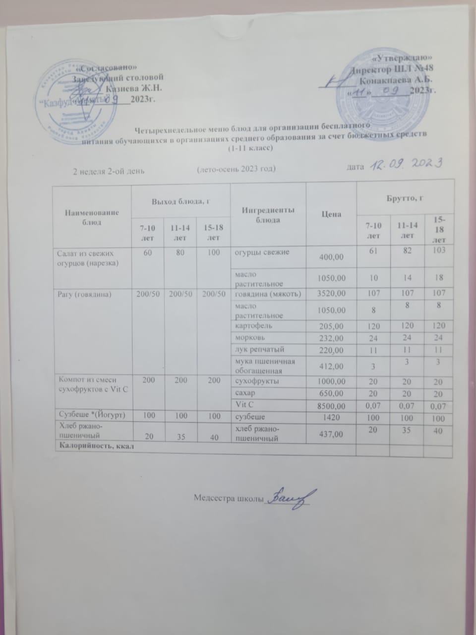Бюджет қаражаты есебінен орта білім беру ұйымдарында білім алушыларды тегін тамақтандыруды ұйымдастыру үшін төрт апталық ас мәзірі/ Четырехнедельное меню блюд для организации бесплатного питания обучающихся в организациях среднего образования за счет бюджетных средств