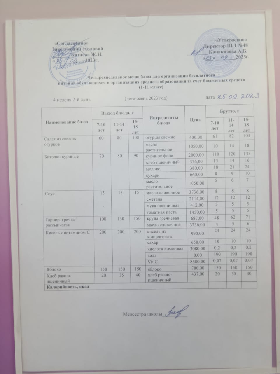 Бюджет қаражаты есебінен орта білім беру ұйымдарында білім алушыларды тегін тамақтандыруды ұйымдастыру үшін төрт апталық ас мәзірі/ Четырехнедельное меню блюд для организации бесплатного питания обучающихся в организациях среднего образования за счет бюджетных средств