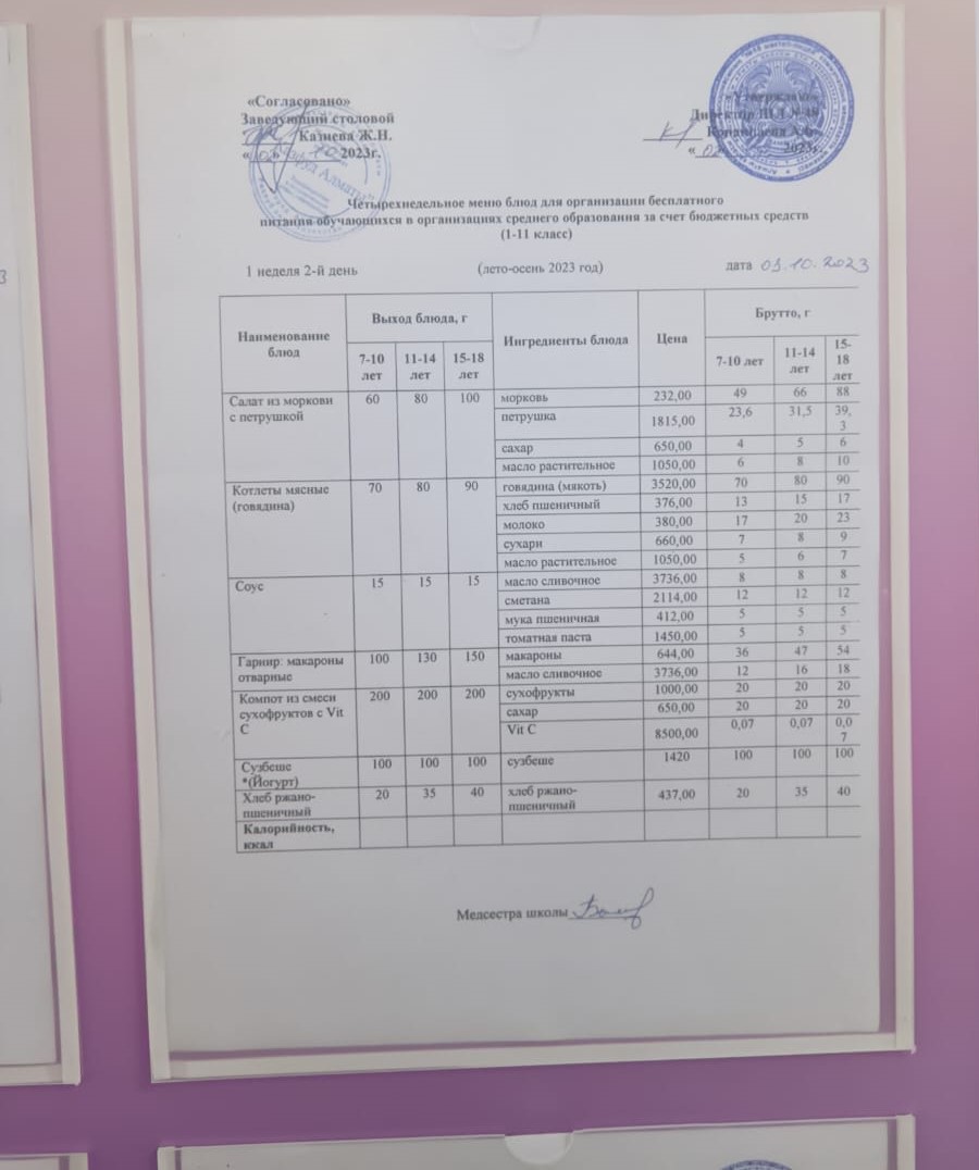Бюджет қаражаты есебінен орта білім беру ұйымдарында білім алушыларды тегін тамақтандыруды ұйымдастыру үшін төрт апталық ас мәзірі/ Четырехнедельное меню блюд для организации бесплатного питания обучающихся в организациях среднего образования за счет бюджетных средств