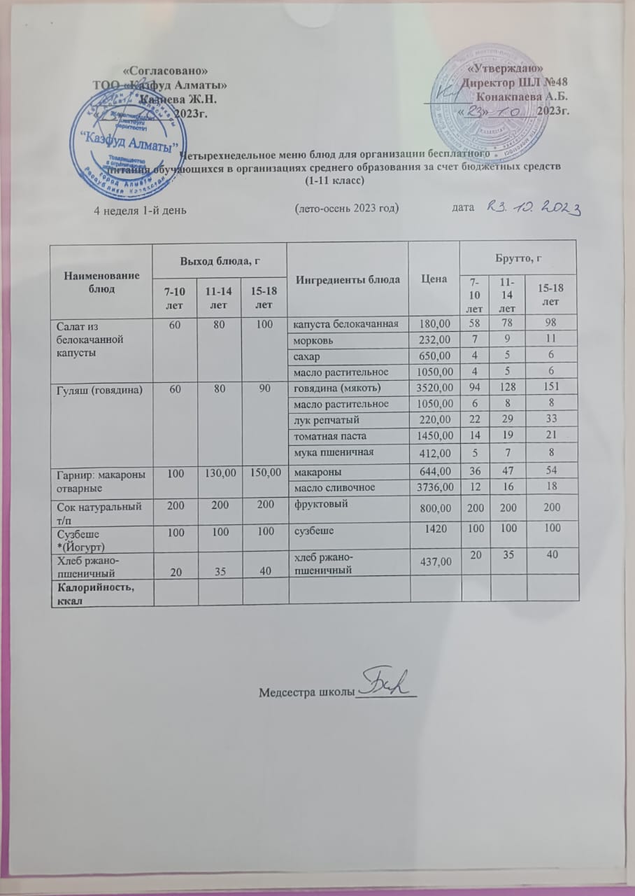 Бюджет қаражаты есебінен орта білім беру ұйымдарында білім алушыларды тегін тамақтандыруды ұйымдастыру үшін төрт апталық ас мәзірі/ Четырехнедельное меню блюд для организации бесплатного питания обучающихся в организациях среднего образования за счет бюджетных средств