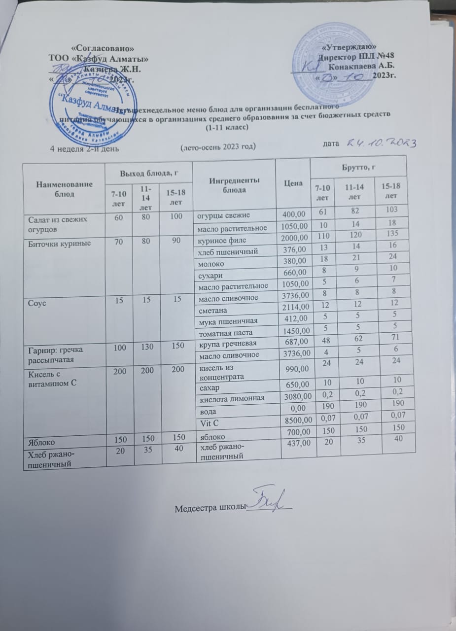Бюджет қаражаты есебінен орта білім беру ұйымдарында білім алушыларды тегін тамақтандыруды ұйымдастыру үшін төрт апталық ас мәзірі/ Четырехнедельное меню блюд для организации бесплатного питания обучающихся в организациях среднего образования за счет бюджетных средств