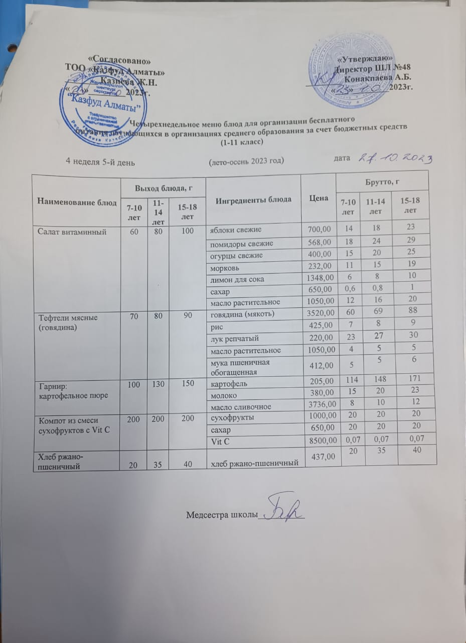 Бюджет қаражаты есебінен орта білім беру ұйымдарында білім алушыларды тегін тамақтандыруды ұйымдастыру үшін төрт апталық ас мәзірі/ Четырехнедельное меню блюд для организации бесплатного питания обучающихся в организациях среднего образования за счет бюджетных средств