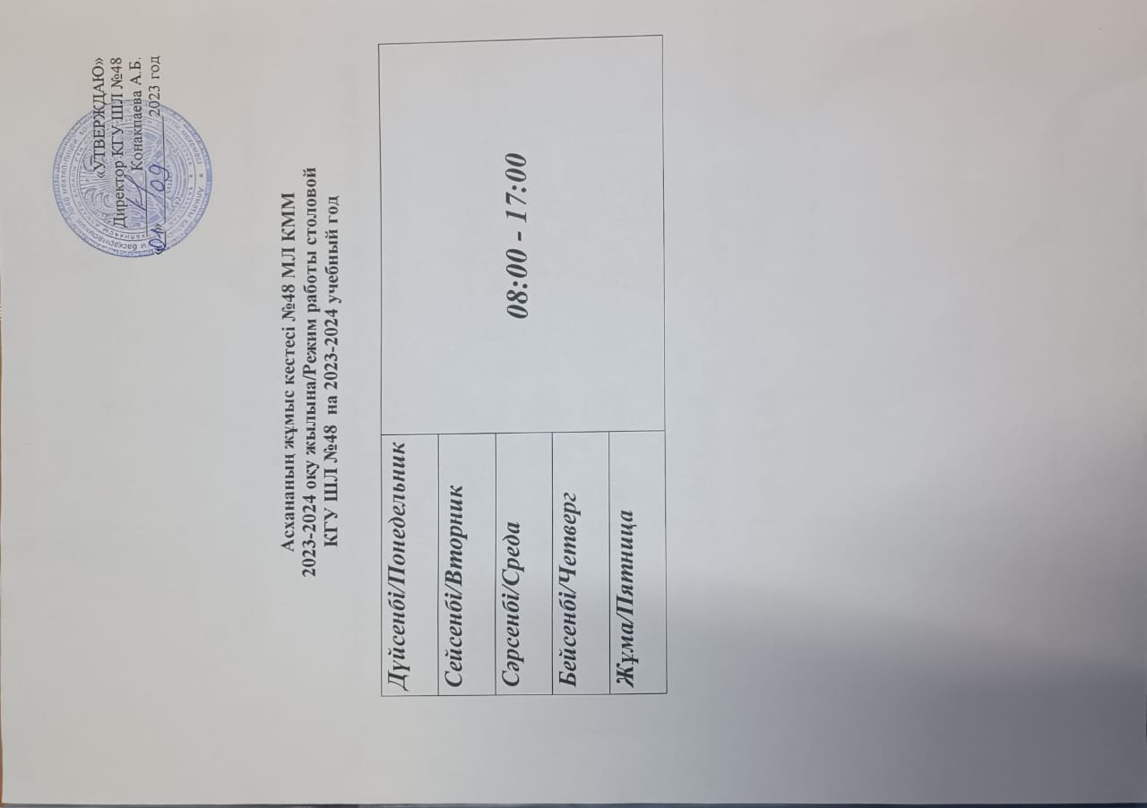 01 қыркүйек 2023 0 1 2 3 4 5 Асхананың жұмыс кестесі №48 МЛ КММ 2023-2024 оқу жылына Режим работы столовой КГУ ШЛ №48 на 2023-2024 учебный год