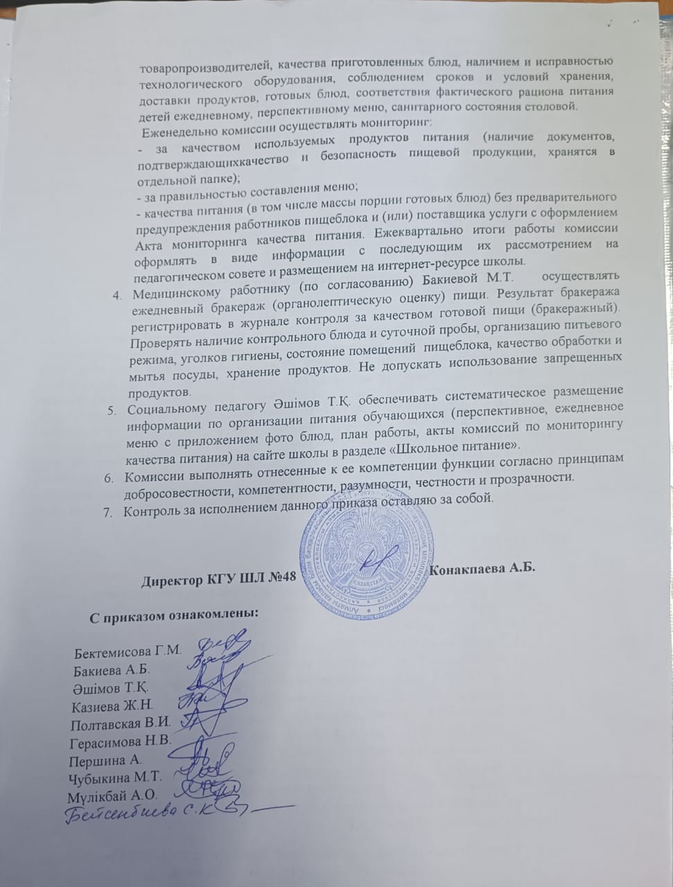 01 қыркүйек 2023 0 1 2 3 4 5 Тамақтану сапасына мониторинг жүргізу жөніндегі комиссия (бракераж комиссиясы)құру туралы О создании комиссии по мониторингу за качеством питания (бракеражная комиссия)