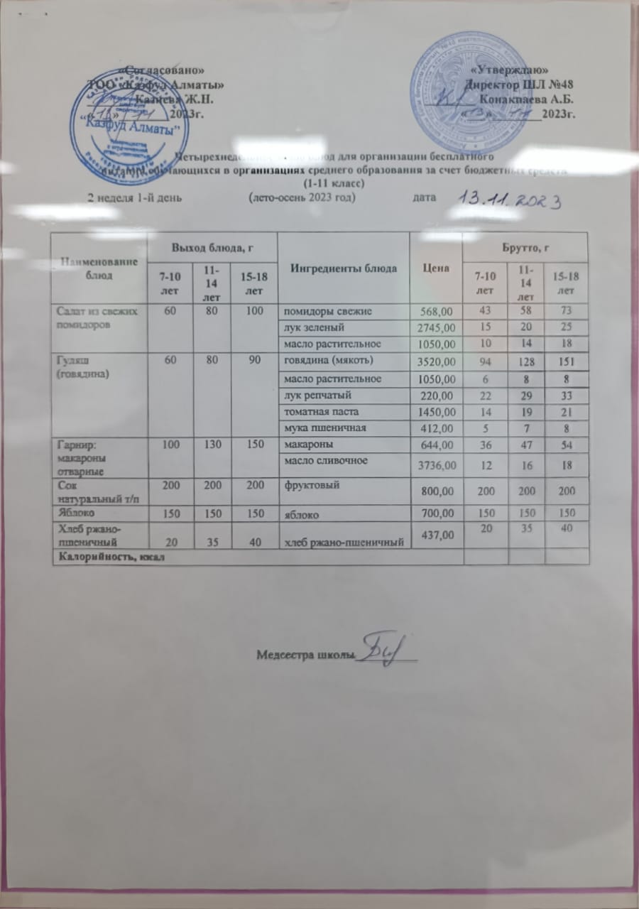 Бюджет қаражаты есебінен орта білім беру ұйымдарында білім алушыларды тегін тамақтандыруды ұйымдастыру үшін төрт апталық ас мәзірі/ Четырехнедельное меню блюд для организации бесплатного питания обучающихся в организациях среднего образования за счет бюджетных средств