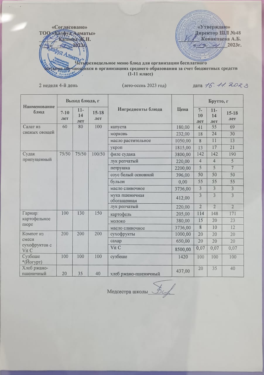 Бюджет қаражаты есебінен орта білім беру ұйымдарында білім алушыларды тегін тамақтандыруды ұйымдастыру үшін төрт апталық ас мәзірі/ Четырехнедельное меню блюд для организации бесплатного питания обучающихся в организациях среднего образования за счет бюджетных средств