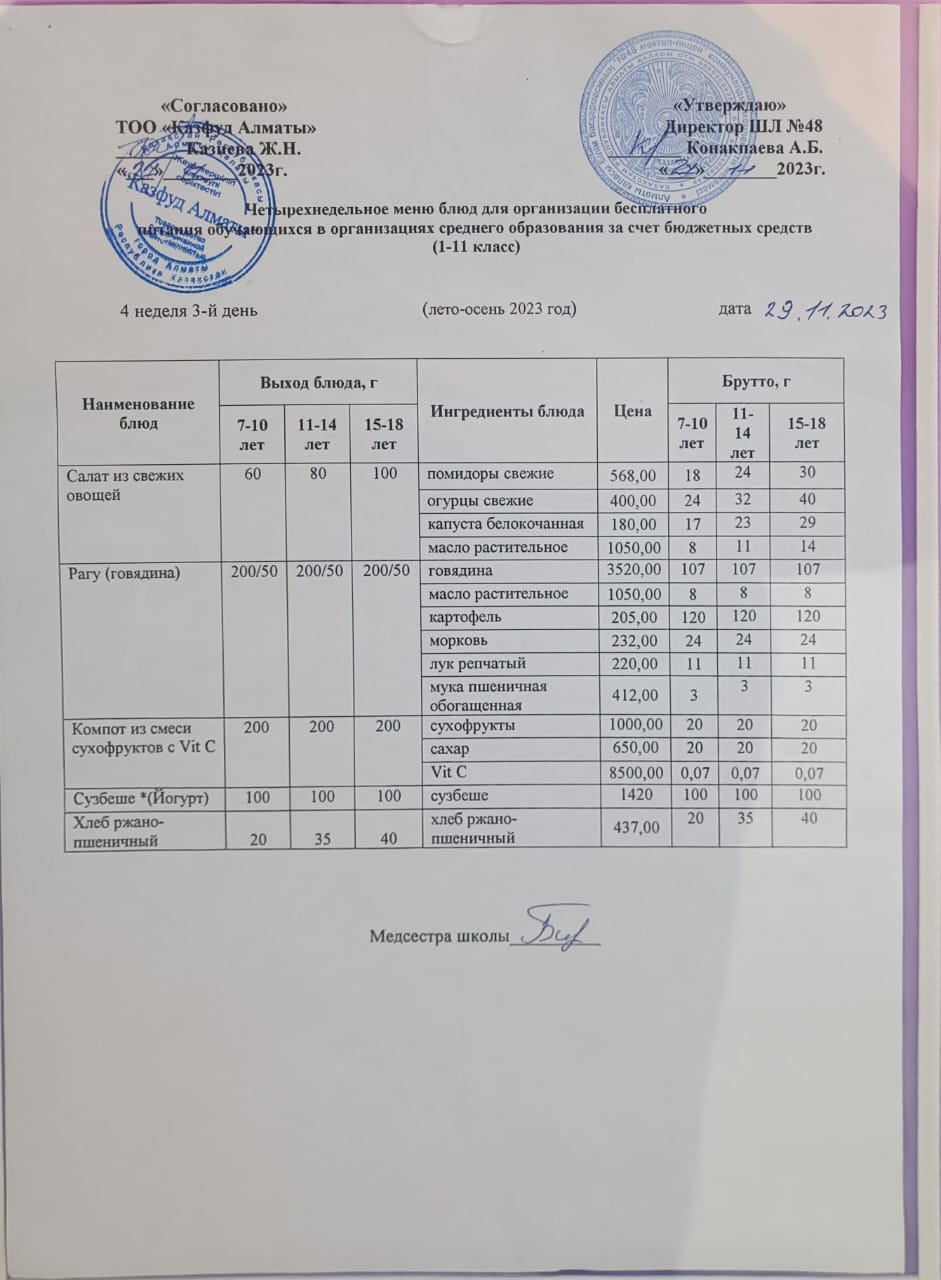 Бюджет қаражаты есебінен орта білім беру ұйымдарында білім алушыларды тегін тамақтандыруды ұйымдастыру үшін төрт апталық ас мәзірі/ Четырехнедельное меню блюд для организации бесплатного питания обучающихся в организациях среднего образования з а счет бюджетных средств