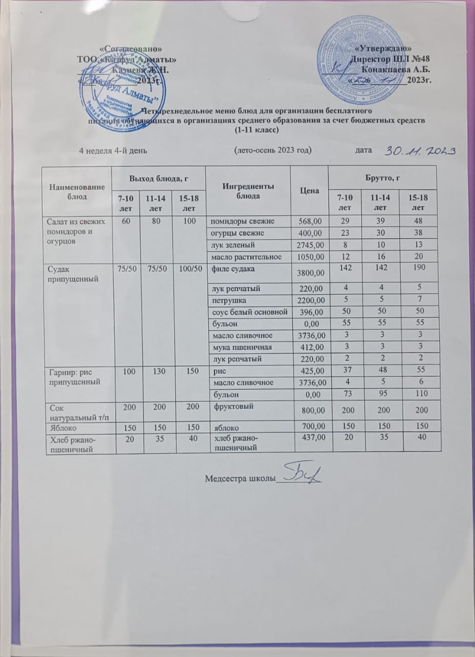 Бюджет қаражаты есебінен орта білім беру ұйымдарында білім алушыларды тегін тамақтандыруды ұйымдастыру үшін төрт апталық ас мәзірі/ Четырехнедельное меню блюд для организации бесплатного питания обучающихся в организациях среднего образования з а счет бюджетных средств
