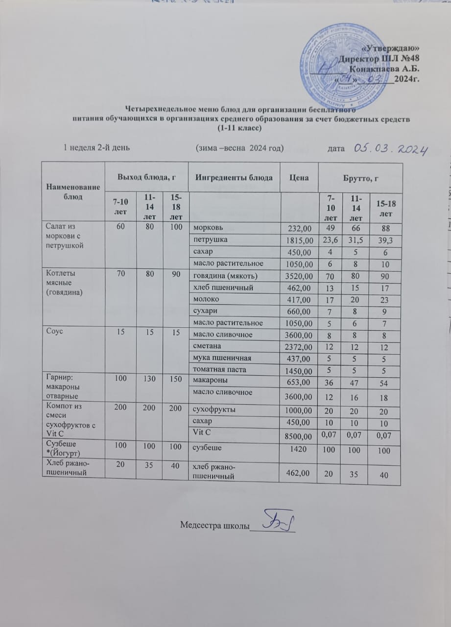 Бюджет қаражаты есебінен орта білім беру ұйымдарында білім алушыларды тегін тамақтандыруды ұйымдастыру үшін төрт апталық ас мәзірі/ Четырехнедельное меню блюд для организации бесплатного питания обучающихся в организациях среднего образования з а счет бюджетных средств