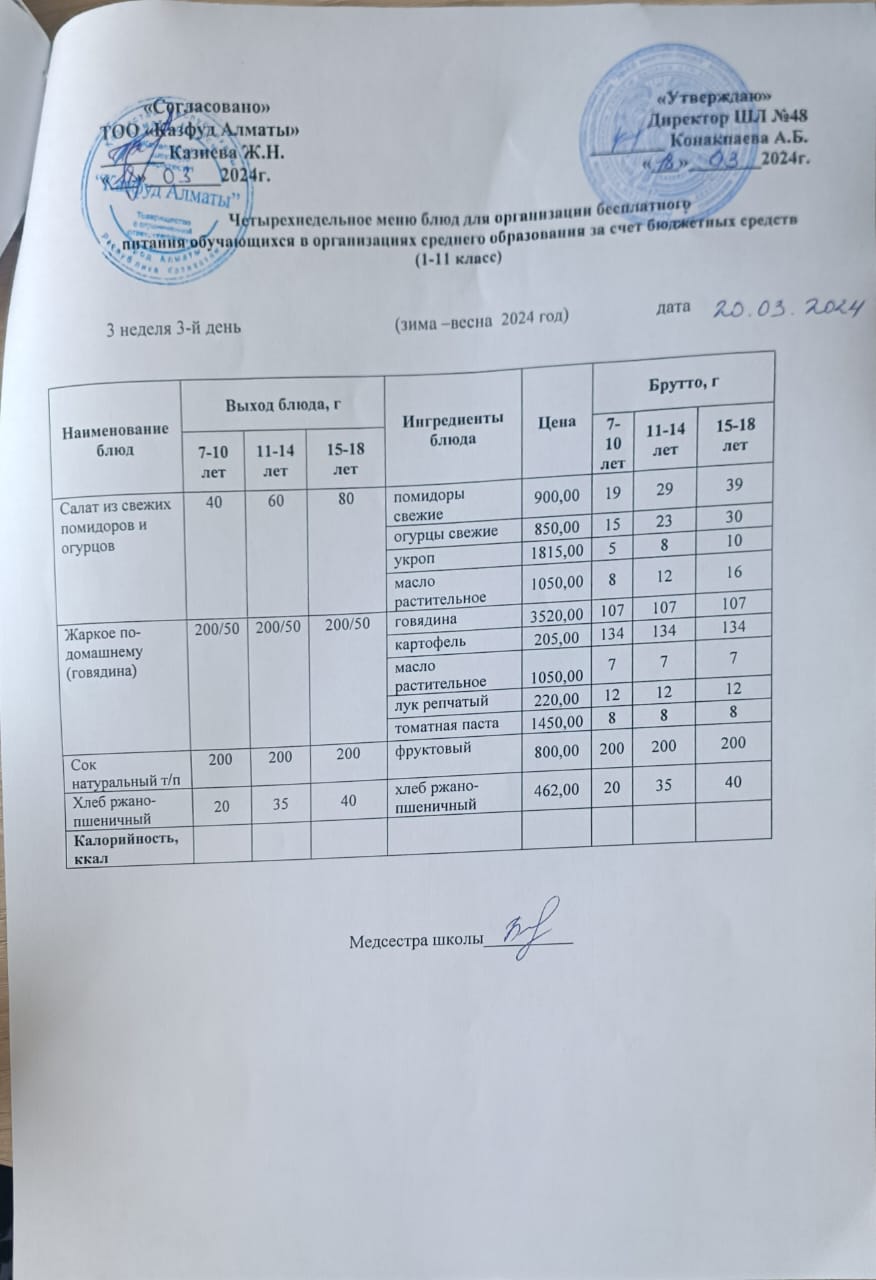 Бюджет қаражаты есебінен орта білім беру ұйымдарында білім алушыларды тегін тамақтандыруды ұйымдастыру үшін төрт апталық ас мәзірі/ Четырехнедельное меню блюд для организации бесплатного питания обучающихся в организациях среднего образования з а счет бюджетных средств