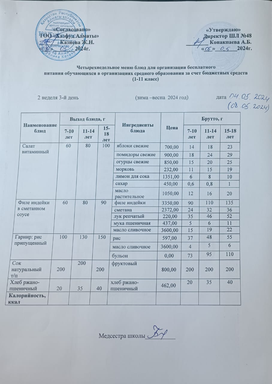 Бюджет қаражаты есебінен орта білім беру ұйымдарында білім алушыларды тегін тамақтандыруды ұйымдастыру үшін төрт апталық ас мәзірі/ Четырехнедельное меню блюд для организации бесплатного питания обучающихся в организациях среднего образования з а счет бюджетных средств
