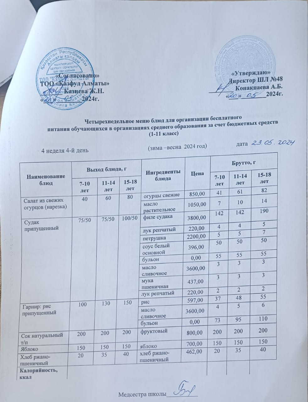 Бюджет қаражаты есебінен орта білім беру ұйымдарында білім алушыларды тегін тамақтандыруды ұйымдастыру үшін төрт апталық ас мәзірі/ Четырехнедельное меню блюд для организации бесплатного питания обучающихся в организациях среднего образования з а счет бюджетных средств