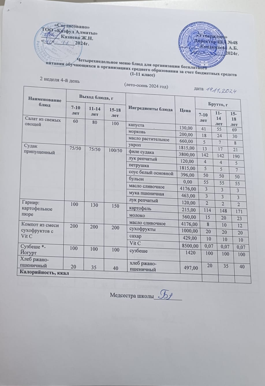 Бюджет қаражаты есебінен орта білім беру ұйымдарында білім алушыларды тегін тамақтандыруды ұйымдастыру үшін төрт апталық ас мәзірі/ Четырехнедельное меню блюд для организации бесплатного питания обучающихся в организациях среднего образования за счет бюджетных средств