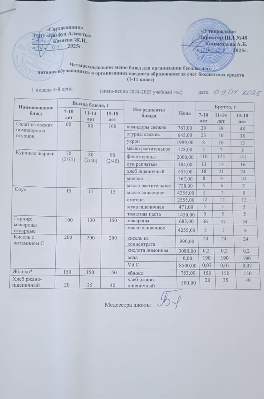 Бюджет қаражаты есебінен орта білім беру ұйымдарында білім алушыларды тегін тамақтандыруды ұйымдастыру үшін төрт апталық ас мәзірі/ Четырехнедельное меню блюд для организации бесплатного питания обучающихся в организациях среднего образования за счет бюджетных средств