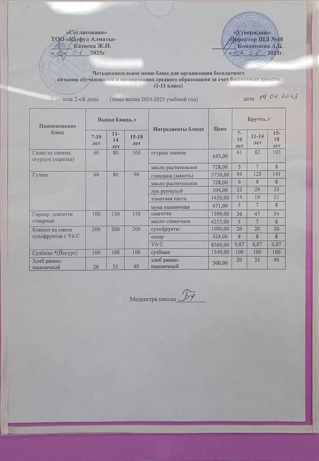 Бюджет қаражаты есебінен орта білім беру ұйымдарында білім алушыларды тегін тамақтандыруды ұйымдастыру үшін төрт апталық ас мәзірі/ Четырехнедельное меню блюд для организации бесплатного питания обучающихся в организациях среднего образования за счет бюджетных средств