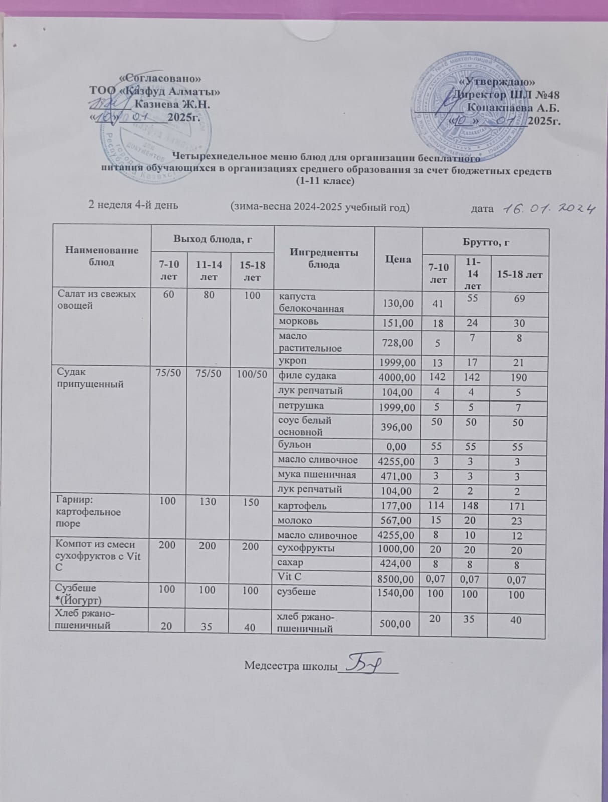 Бюджет қаражаты есебінен орта білім беру ұйымдарында білім алушыларды тегін тамақтандыруды ұйымдастыру үшін төрт апталық ас мәзірі/ Четырехнедельное меню блюд для организации бесплатного питания обучающихся в организациях среднего образования за счет бюджетных средств