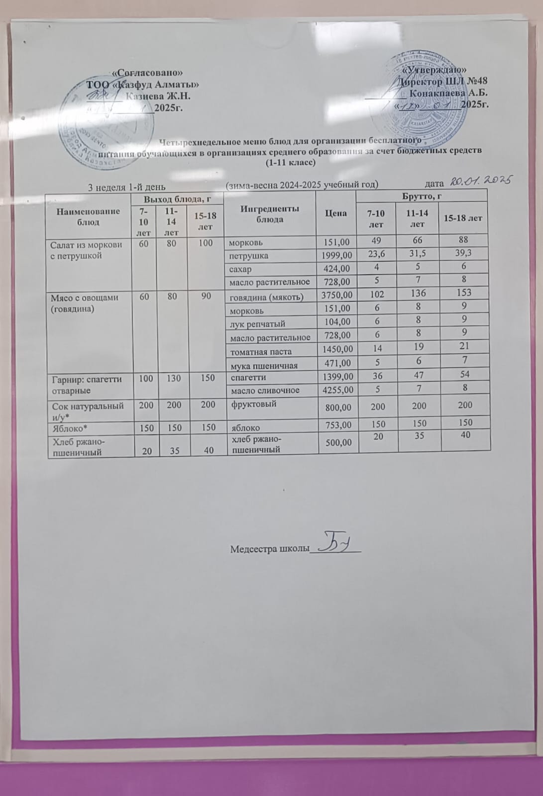 Бюджет қаражаты есебінен орта білім беру ұйымдарында білім алушыларды тегін тамақтандыруды ұйымдастыру үшін төрт апталық ас мәзірі/ Четырехнедельное меню блюд для организации бесплатного питания обучающихся в организациях среднего образования за счет бюджетных средств