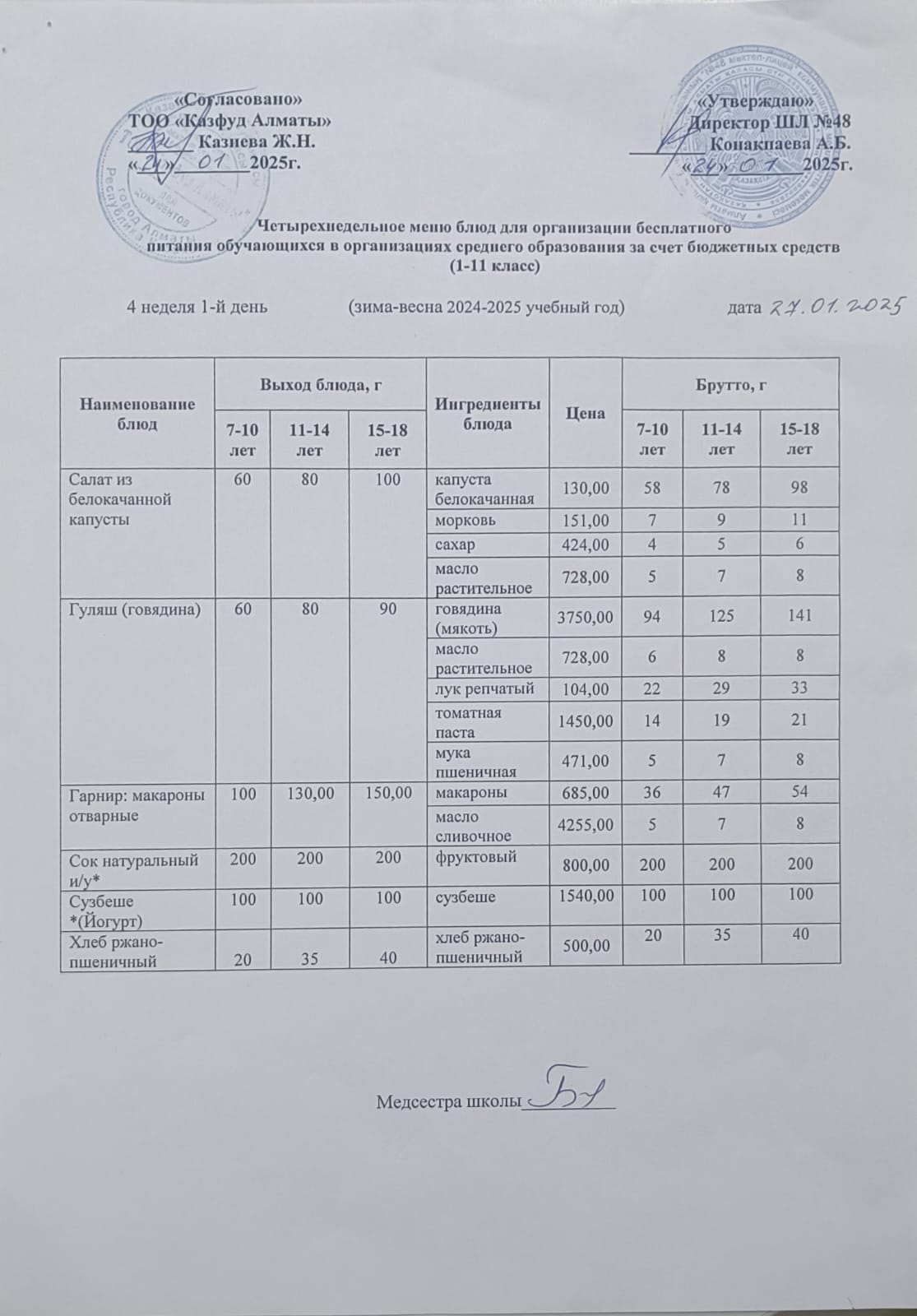 Бюджет қаражаты есебінен орта білім беру ұйымдарында білім алушыларды тегін тамақтандыруды ұйымдастыру үшін төрт апталық ас мәзірі/ Четырехнедельное меню блюд для организации бесплатного питания обучающихся в организациях среднего образования за счет бюджетных средств