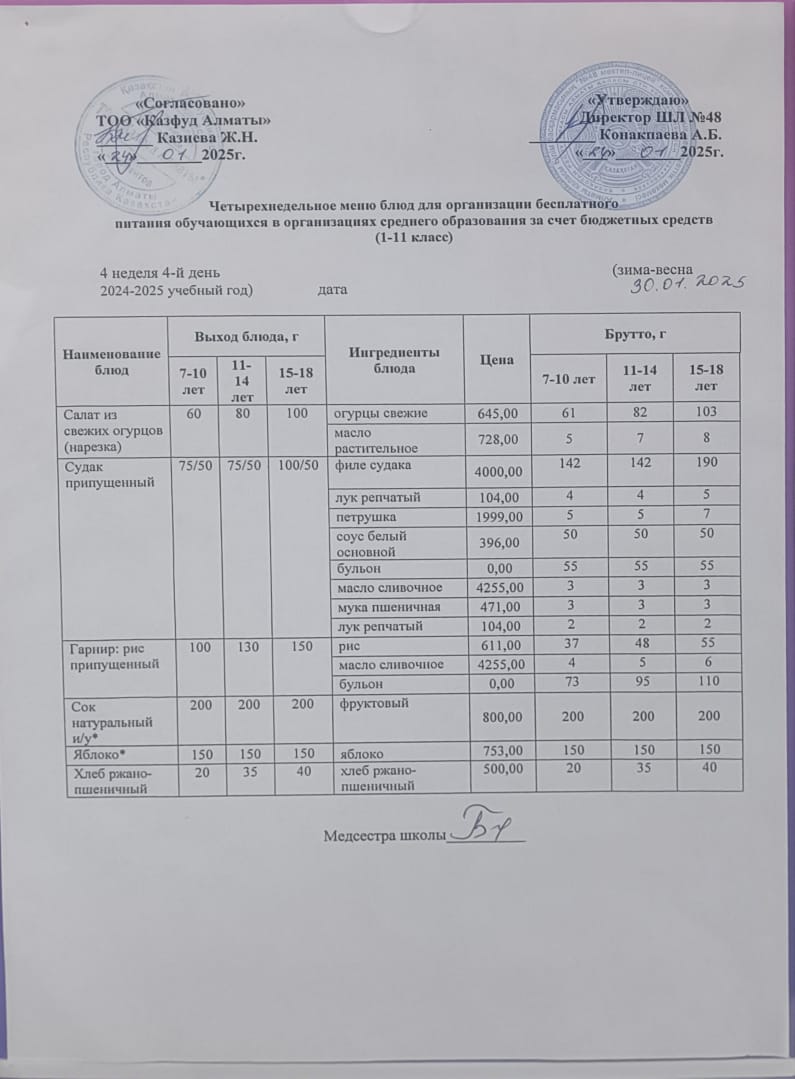 Бюджет қаражаты есебінен орта білім беру ұйымдарында білім алушыларды тегін тамақтандыруды ұйымдастыру үшін төрт апталық ас мәзірі/ Четырехнедельное меню блюд для организации бесплатного питания обучающихся в организациях среднего образования за счет бюджетных средств