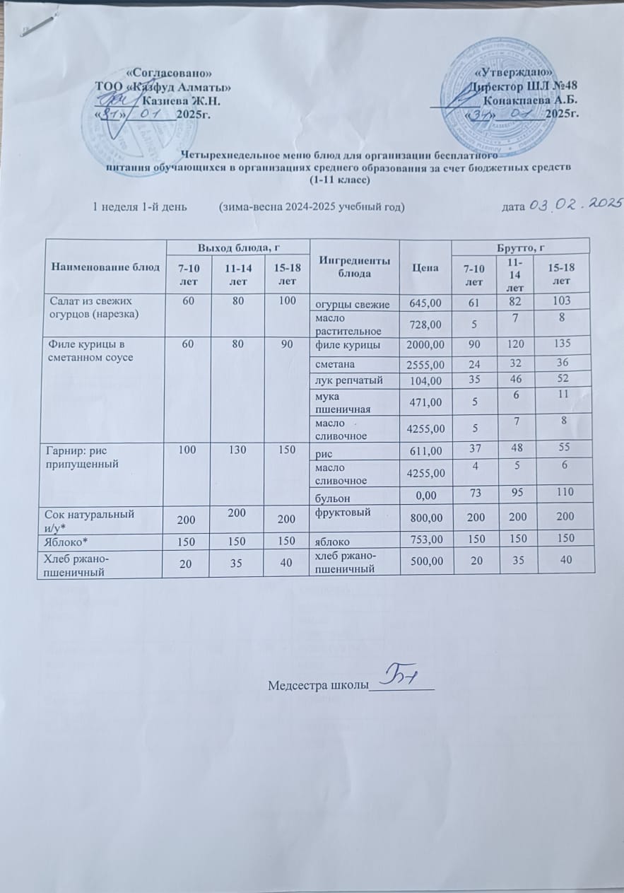 Бюджет қаражаты есебінен орта білім беру ұйымдарында білім алушыларды тегін тамақтандыруды ұйымдастыру үшін төрт апталық ас мәзірі/ Четырехнедельное меню блюд для организации бесплатного питания обучающихся в организациях среднего образования за счет бюджетных средств