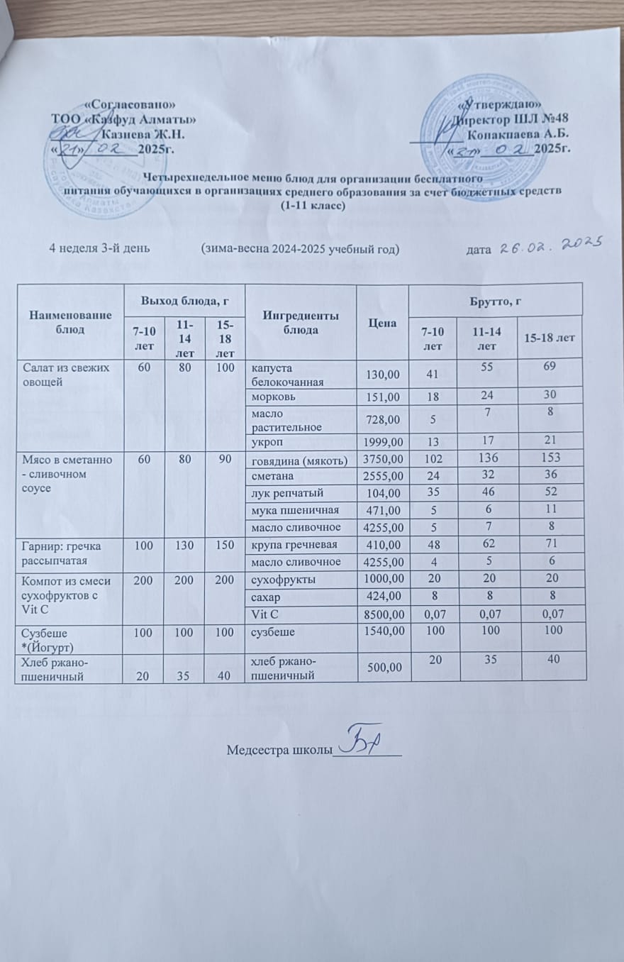 Бюджет қаражаты есебінен орта білім беру ұйымдарында білім алушыларды тегін тамақтандыруды ұйымдастыру үшін төрт апталық ас мәзірі/ Четырехнедельное меню блюд для организации бесплатного питания обучающихся в организациях среднего образования за счет бюджетных средств
