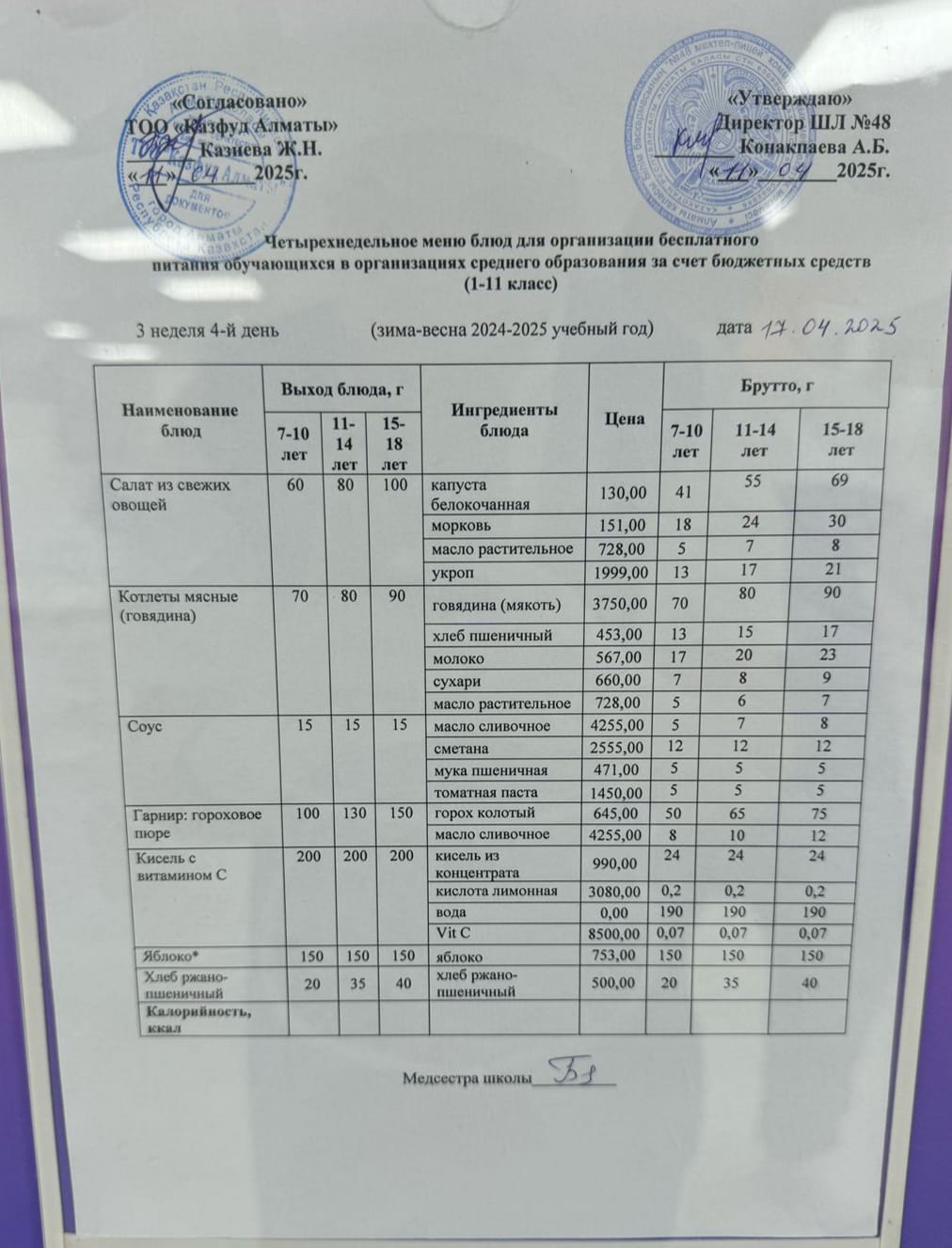 Бюджет қаражаты есебінен орта білім беру ұйымдарында білім алушыларды тегін тамақтандыруды ұйымдастыру үшін төрт апталық ас мәзірі/ Четырехнедельное меню блюд для организации бесплатного питания обучающихся в организациях среднего образования за счет бюджетных средств