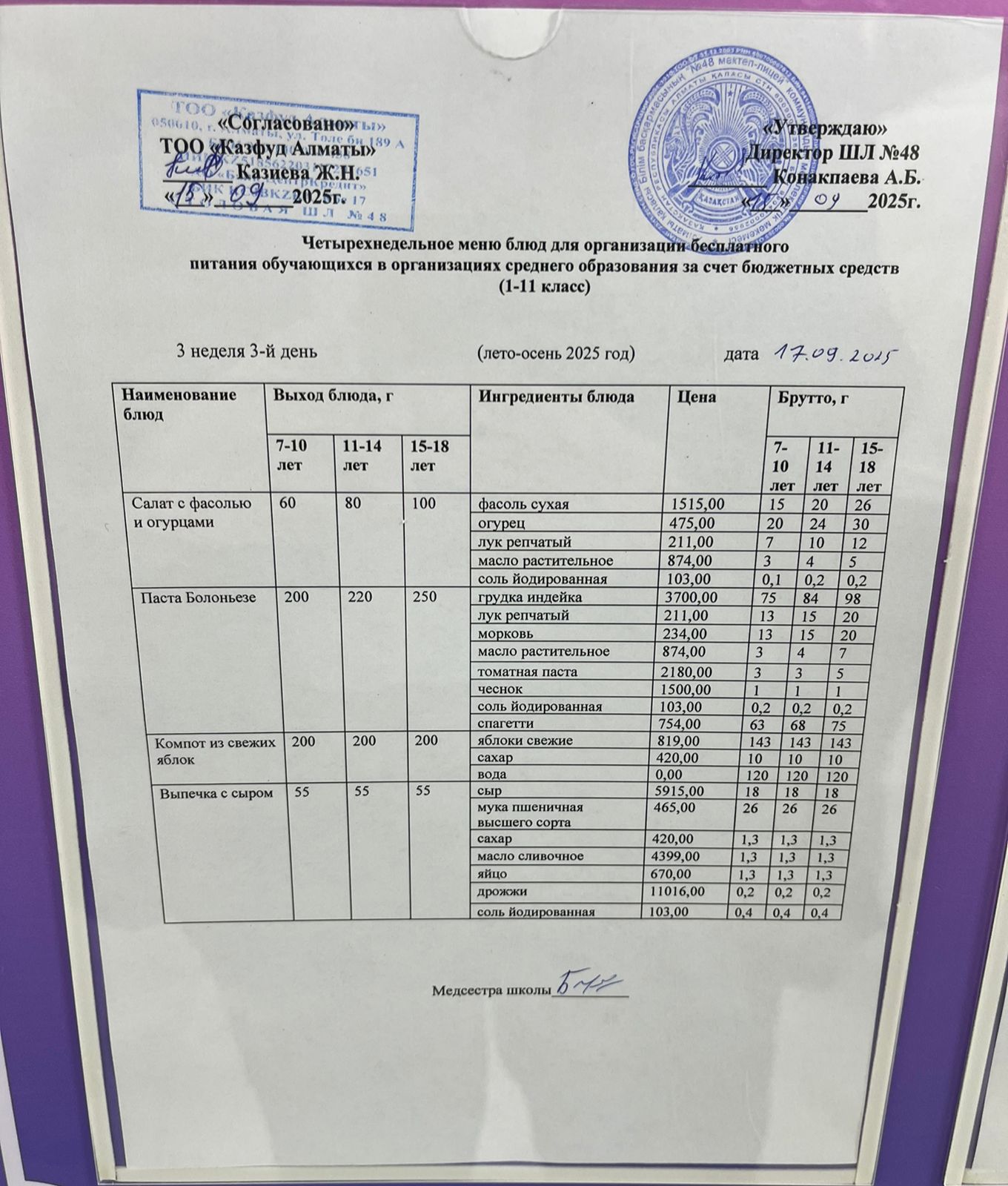 Бюджет қаражаты есебінен орта білім беру ұйымдарында білім алушыларды тегін тамақтандыруды ұйымдастыру үшін төрт апталық ас мәзірі/ Четырехнедельное меню блюд для организации бесплатного питания обучающихся в организациях среднего образования за счет бюджетных средств